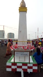 Gerobak monas saya buat merupakan gambaran bahwa kampung ini adalah wilayah DKI Jakarta, kita bagian dari DKI Jakarta, juga bagian dari yang paling luas yaitu Indoensia.”Tutur pak Tedi, warga kampung Akuarium, peserta lomba gerobak memori.